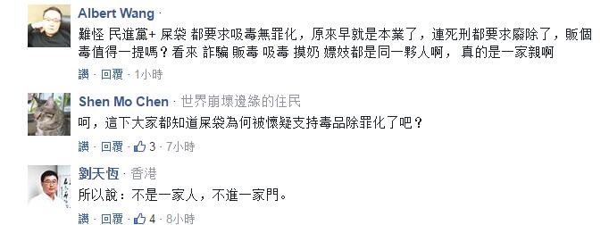 還有網(wǎng)友驚覺道“難怪屎袋(注:島內(nèi)網(wǎng)友對“時(shí)代力量”的“愛稱”)會(huì)支持民進(jìn)黨的‘毒品除罪化’主張”、“不是一家人不進(jìn)一家門啊”。