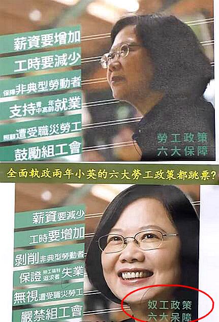 想當(dāng)年,蔡英文靠著“勞工是民進(jìn)黨心里最軟的那一塊”的“告白”成功俘獲島內(nèi)的勞工大軍,如今民進(jìn)黨當(dāng)局上臺(tái)即將屆滿兩年,回看曾在競(jìng)選時(shí)提出“18項(xiàng)勞動(dòng)政見(jiàn)”、“6大勞工政策保障”支票的蔡英文,現(xiàn)在到底兌現(xiàn)了多少呢?