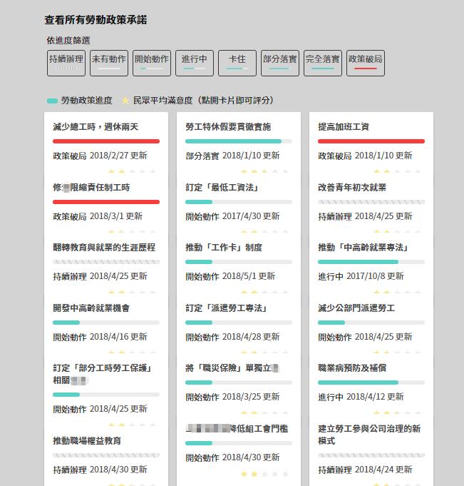 島內(nèi)非營(yíng)利網(wǎng)媒《報(bào)導(dǎo)者》為此特意制作了“蔡英文勞動(dòng)政策追蹤大平臺(tái)”,結(jié)果顯示,截至勞動(dòng)節(jié)當(dāng)天,不僅“完全落實(shí)”的為0項(xiàng),更有3項(xiàng)“政策破局”到已然跳票,而唯一“部分落實(shí)”的僅是“勞工特休假要貫徹實(shí)施”……