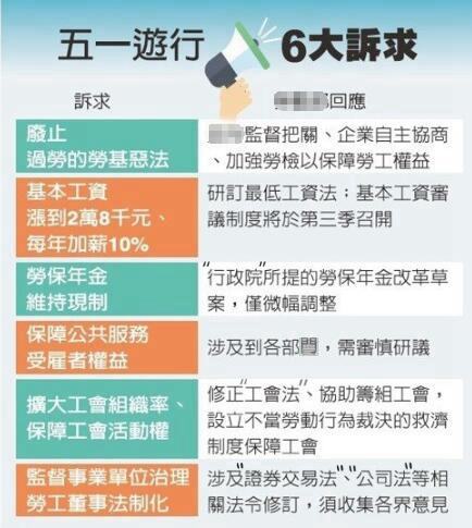 另外,這次游行的主軸除上述“勞權(quán)‘公投’”以外,還對(duì)勞工薪資制度的不合理提出了要求和抗?fàn),包括要求連續(xù)三年“加薪10%”,希望“修法”通過(guò),以實(shí)現(xiàn)共計(jì)三年內(nèi)為勞工調(diào)薪三成。