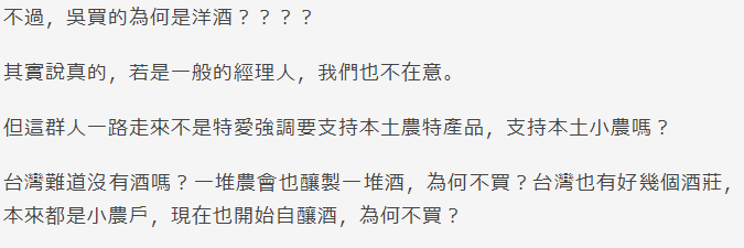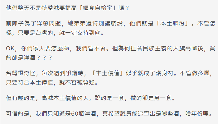 再來說送禮的內(nèi)容,洋酒。以往蔡英文曾被爆料愛吃法國大餐,這回吳音寧送禮送洋酒算是對上了。只不過你吳音寧口口聲聲說要支持本土農(nóng)產(chǎn)品,霸占道德高地,到頭來卻做起了洋酒“生意”,不覺得臉疼嗎?下面這位臺灣網(wǎng)友說出了大部分人心里的感受: