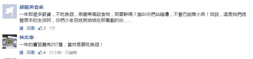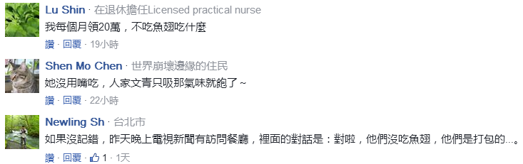 她表示,5月9日吳音寧還在臉譜網(wǎng)大談,北農(nóng)的基層有多么辛苦,所以為北農(nóng)加薪!5月11日,她就在高雄吃魚翅。蔡英文吃法國料理挨轟、李應元吃魚翅道歉,比起他們的小老妹日子爽爽過,其實還真冤枉了。