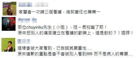 對此,網(wǎng)友們表示:“家屬會一次請三個看護,推卸責(zé)任也專業(yè)一點”“原來把別人的痛苦建立在看護的歡樂上,這是對的?!”“原來道歉的重點是會不會被人看到,而不是病人的尊嚴”。