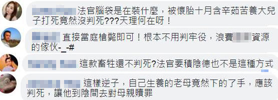 對此,網(wǎng)友痛批:“法官腦袋是裝什么,被懷胎十月含辛茹苦養(yǎng)大兒子打死竟然沒判死?天理何在!”“根本不用判勞役,浪費資源的家伙”“法官要積陰德也不是這種方式”“這種逆子應(yīng)該判死,讓他到陰間對母親贖罪”。