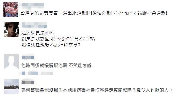 貼文引爆網(wǎng)友怒火,“臺灣真的養(yǎng)奧客,還出來道歉!不排隊的人才該跟社會道歉”“如果是我就回,我不做你生意不行嗎?哪條法律說我不能拒絕交易?”“為何警察拿他沒轍?不能用妨害社會秩序趕走或罰款嗎”。