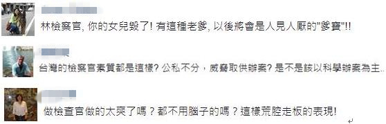 對此,臺灣網友紛紛表示:“有這種老爹,以后將會是人見人討厭的爹寶”“臺灣的檢察官素質就這樣?公私不分,威脅取供辦案?”“做檢察官做得太爽了嗎?都不用腦子的嗎?這樣荒腔走板的表現”。