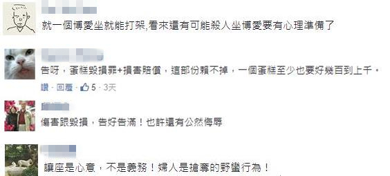 有的網友回復“傷害跟損毀,告好告滿!也許還有公然侮辱”,有的網友強調“讓座是心意,不是義務!婦人是搶奪的野蠻行為”,還有的網友甚至說:“就一個博愛座就能打架,看來還有可能殺人,坐博愛座要有心理準備了”。