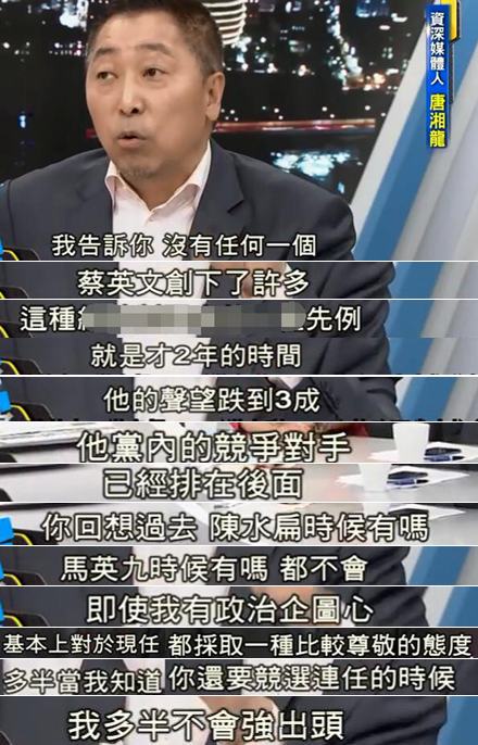 資深媒體人唐湘龍也表示,蔡英文執(zhí)政才2年,聲望就能跌倒3成一下,簡(jiǎn)直“不可思議”!