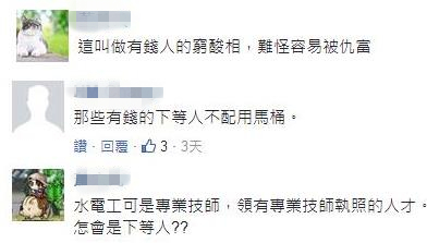 網友多數一面倒的力挺原PO,“這叫做有錢人的窮酸相,難怪容易被仇富”“真的很厲害的人才不會看不起別人”“水電工可是專業(yè)技師,領有專業(yè)技師執(zhí)照的人才,怎會是下等人?”“每個行業(yè)都是一個螺絲釘,沒有這些螺絲釘,我相信他們連住的地方都沒有”“那些有錢的下等人不配用馬桶”。