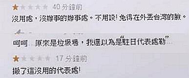 如此傲慢冷漠的態(tài)度也讓日本人看不下去了。有臺媒報(bào)道,位于東京都的“臺北駐日經(jīng)濟(jì)文化代表處”在“Google”上的評價中甚至出現(xiàn)許多日本人用日文大肆批評的聲音,“態(tài)度非常糟糕,這就是臺灣的服務(wù)嗎?”、“接待水平真糟糕,對臺灣來說真的是一種恥辱”、“工作態(tài)度傲慢、這里的服務(wù)太離譜了,氣死我了”、“這就是臺灣人?我討厭臺灣人!”……