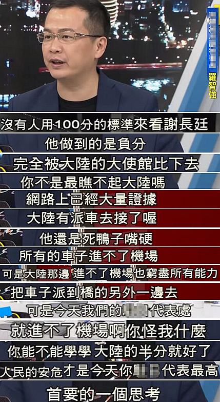 馬辦前秘書長羅智強(qiáng)也一語中的地指出——謝長廷做到的根本是負(fù)分!更直言,謝長廷這次被“最瞧不起的大陸”完全比下去了,“你能學(xué)到大陸的半分就好”!