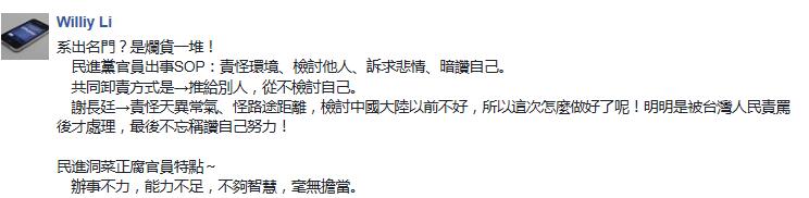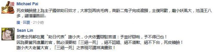 當(dāng)臺客身陷囹圄時,臺灣“駐日代表處”拿不出有效的辦法解決問題不說,連身為“駐日代表”的謝長廷,當(dāng)下竟還在打“政治口水戰(zhàn)”的批評島內(nèi)事務(wù)、檢討國民黨主席吳敦義,而針對民眾對其救援不力、毫無作為的指控更全盤否認(rèn),還抱怨稱其他地方的人民也未多做要求,并對罵他的網(wǎng)友喊話“罵要罵得具體”、“網(wǎng)絡(luò)影片罵我都罵三字經(jīng),有的我看年紀(jì)輕輕也不講理,罵我祖宗八代”。