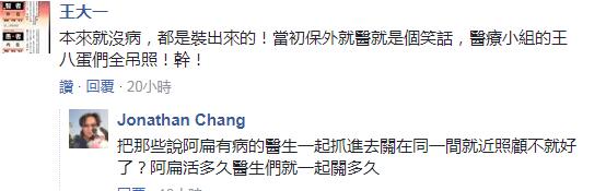 而真正為阿扁做出保外就醫(yī)診斷證明的醫(yī)生也被網(wǎng)友罵是“王八蛋”;
