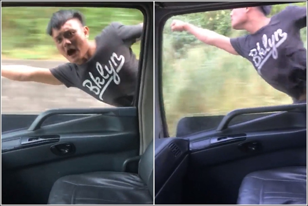 透過影片可見,這名男子在卡車行進時,先用左手抓住貨車固定好自己,身體向外懸出車窗,右手往前伸直,貌似超人的模樣正在飛行,隨后他對著車內(nèi)的駕駛員詢問:“要買東西嗎?有沒有東西要買?沒有嗎?那我走啰!”接著向外呈現(xiàn)出“飛走”的模樣消失在鏡頭前。