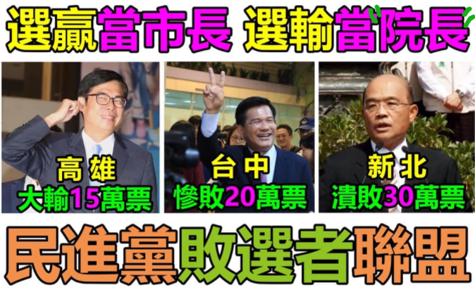 按道理講,故事進行到這里,隨著林佳龍的卸任,山手線這事兒也就了了。不過沒想到,在“九合一”選舉大敗之后,沒演夠的蔡英文立即推出了“九合一”第二季——敗選者聯(lián)盟。在新北、臺中、高雄選輸?shù)奶K貞昌、林佳龍、陳其邁紛紛上位。