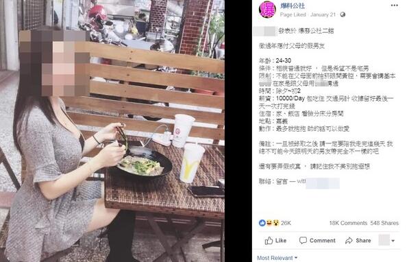 日前島內(nèi)臉譜網(wǎng)的爆系社團(tuán)以及“靠北虎科”、“靠北清大”等版面都出現(xiàn)大量類似的征友文,內(nèi)容提到“征過年應(yīng)付父母的假男友”,條件包含24-30歲,相貌普通就好,在除夕到初二期間陪征友回家,一天可領(lǐng)1萬元還包吃住……其中最特別的是:要不要一起睡需“看臉”,動作“最多抱抱”,但如果“帥的話可以愛愛”。