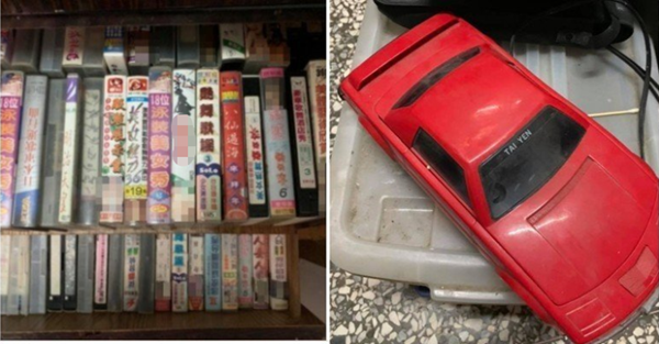 該網(wǎng)友上傳的照片中,可見上下兩層抽屜,里面裝的不是衣服而是許多早期錄影帶,其中不乏有“泳裝美女秀”、“艷舞歌謠”等讓人看名稱就會(huì)害臊的影帶,更有諸如“飯島愛”一類的日本AV影片。此外,照片中還有一臺(tái)紅色汽車外型的錄影帶倒帶機(jī),可見爺爺?shù)拇_裝備齊全。