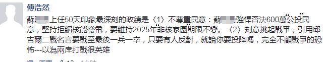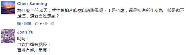 也有網(wǎng)友認為,蘇貞昌根本就是“心虛”或者他很清楚自己所做的事都讓老百姓無感,而只有“無能的人才會細說自己做了什么”,因為“會做事的人不用自己細說,人民都在看”;還有人拿如今風(fēng)頭正勁的韓國瑜類比,直言“韓國瑜有拿影片抬高自己嗎?沒有!但民眾心中有一桿稱”。