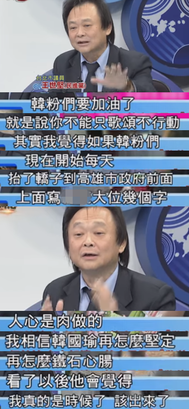 王世堅呼吁,“韓粉”們不要只動口不動手,要抬著轎子,天天去高雄市政府門前求韓國瑜站出來,這樣就會感動韓國瑜。