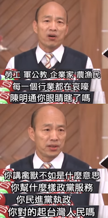 韓國(guó)瑜表示,勞工、軍公教、企業(yè)家、農(nóng)漁民,每一個(gè)行業(yè)都在哀號(hào),“陳明通你瞎了嗎?講禽獸不如是什么意思?”“我們?cè)谄唇?jīng)濟(jì),你講這么惡毒的話是什么意思?陳明通你的書是讀到狗的肚子里面了嗎?你把你的知識(shí)拿來維護(hù)你的官位,昧著良心講話嗎?用禽獸兩字形容有必要嗎?”