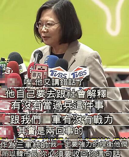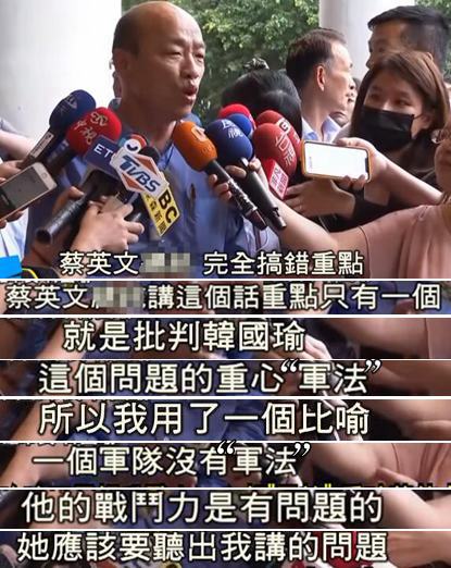 而面對(duì)藍(lán)營(yíng)頭號(hào)戰(zhàn)將韓國(guó)瑜,蔡英文更是長(zhǎng)槍大炮齊上陣,遠(yuǎn)的咱就不說了,這兩天她又開始揪著韓國(guó)瑜的“太監(jiān)說”不放,更仗著自己是“三軍統(tǒng)帥”,兩度嗆韓、要他把話“收回去”。