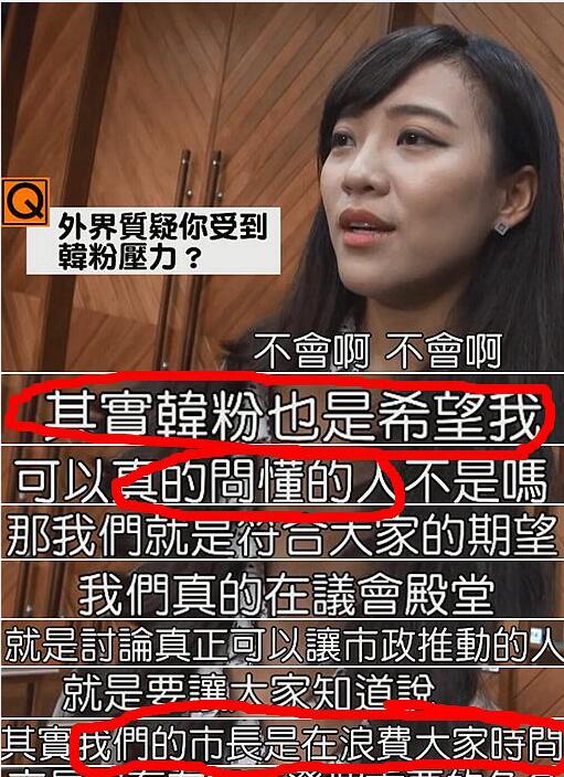 她認為,在之前的質(zhì)詢會上,韓國瑜沒有對任何問題作出具體的回應(yīng),再問他的話,不僅浪費自己的時間,也浪費高雄市民的時間。