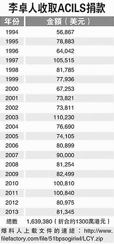 大公報(bào)文章說(shuō),香港網(wǎng)民“旺角腦場(chǎng)起底組”近日上載于網(wǎng)絡(luò)的大量文件揭露,李卓人所領(lǐng)導(dǎo)的“香港職工會(huì)聯(lián)盟(簡(jiǎn)稱職工盟)”號(hào)稱政治中立組織,卻自1994年以來(lái),每年均向美國(guó)國(guó)家民主基金會(huì)(NED)旗下的美國(guó)國(guó)際勞工團(tuán)結(jié)中心(ACILS)申請(qǐng)5萬(wàn)至10多萬(wàn)美元資助,至今已接受合共多達(dá)近164萬(wàn)美元,折合約1300萬(wàn)港元捐款。