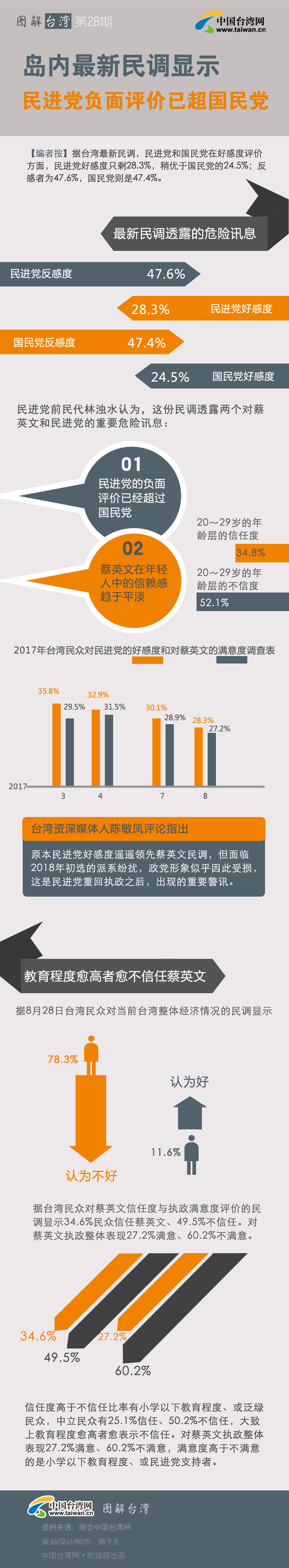 【編者按】據(jù)臺灣最新民調(diào),民進黨和國民黨在好感度評價方面,民進黨好感度只剩28.3%,稍優(yōu)于國民黨的24.5%;反感者為47.6%,國民黨則是47.4%。