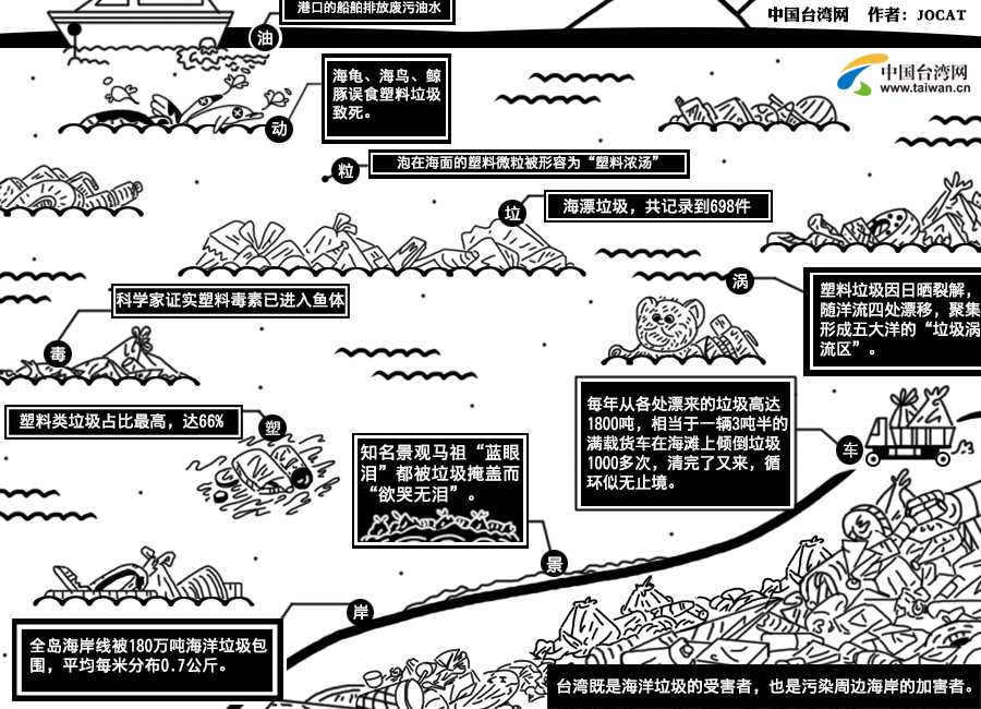 有島內(nèi)學(xué)者形容,臺灣受大陸沿岸流、日本暖流和季風(fēng)影響,被迫成為東亞與南亞海洋垃圾的攔截網(wǎng),加上自己產(chǎn)出的垃圾,寶島已成了被垃圾包圍的島嶼。臺灣既是海洋垃圾的受害者,也是污染周邊海岸的加害者。(文字來源:人民日報(bào)海外版)