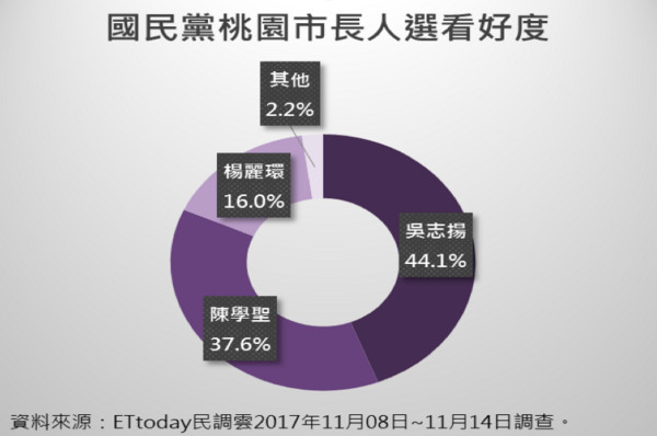 桃園市長方面,吳志揚曾任桃園縣長,2014年代表國民黨參選桃園市長時,敗給民進黨陣營的鄭文燦。據(jù)臺灣“中時電子報”報道,桃園市議會9月份進行2018桃園市長問卷調(diào)查,了解選前1年民眾對于桃園市長人選的意見,共發(fā)出1萬份抽樣。7位可能參與桃園市長人選,暫以吳志揚、陳學(xué)圣、魯明哲領(lǐng)先,吳志揚為現(xiàn)任“立委”也是前任縣長。選民認為吳與鄭文燦競選的機率較高。