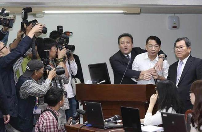 “時(shí)代力量立委”徐永明(右二)強(qiáng)占發(fā)言臺(tái)近11個(gè)小時(shí)后,在民進(jìn)黨“立委”強(qiáng)力拉扯出“委員會(huì)”后,會(huì)議才可開(kāi)始。(圖片來(lái)源:臺(tái)灣《聯(lián)合報(bào)》)