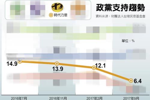 據(jù)《聯(lián)合報(bào)》今年9月份報(bào)道,親綠的臺(tái)灣民意基金會(huì)針對(duì)政黨進(jìn)行支持度的調(diào)查,“時(shí)力”的支持度僅剩6.4%;饡(huì)董事長(zhǎng)游盈隆稱(chēng),“時(shí)力”流失原有支持度的57%,“這對(duì)一個(gè)新興的小黨可以說(shuō)是一個(gè)非常嚴(yán)重的警訊,有邊緣化和泡沫化危機(jī)!