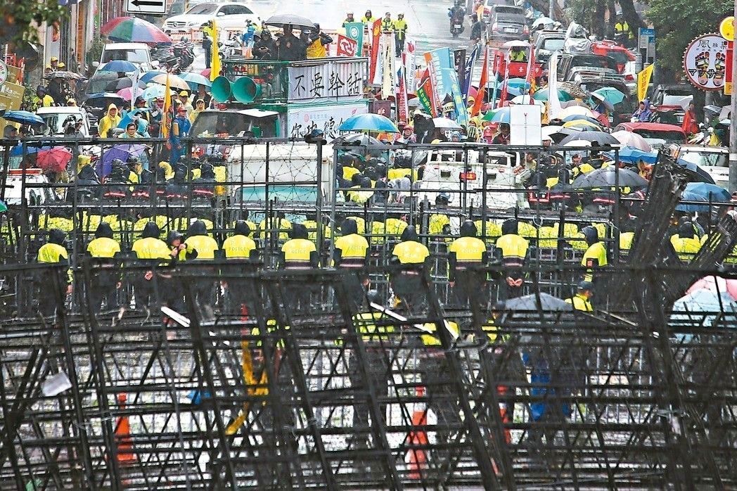 勞工與學(xué)生團(tuán)體23日舉行反“勞基法”修惡大游行,在“行政院”前靜坐的游行群眾,晚間再度與警方爆發(fā)肢體沖突。(圖片來源:臺(tái)灣《中時(shí)電子報(bào)》)