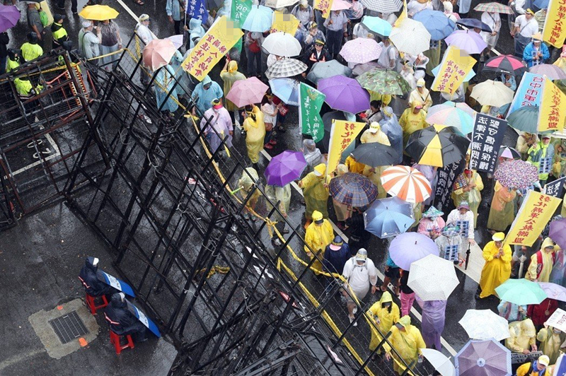 “立法院臨時會”審查年金改革法案,退休軍公教走上街頭,警力架起拒馬隔絕人群。(圖片來源:臺灣《聯(lián)合報》)