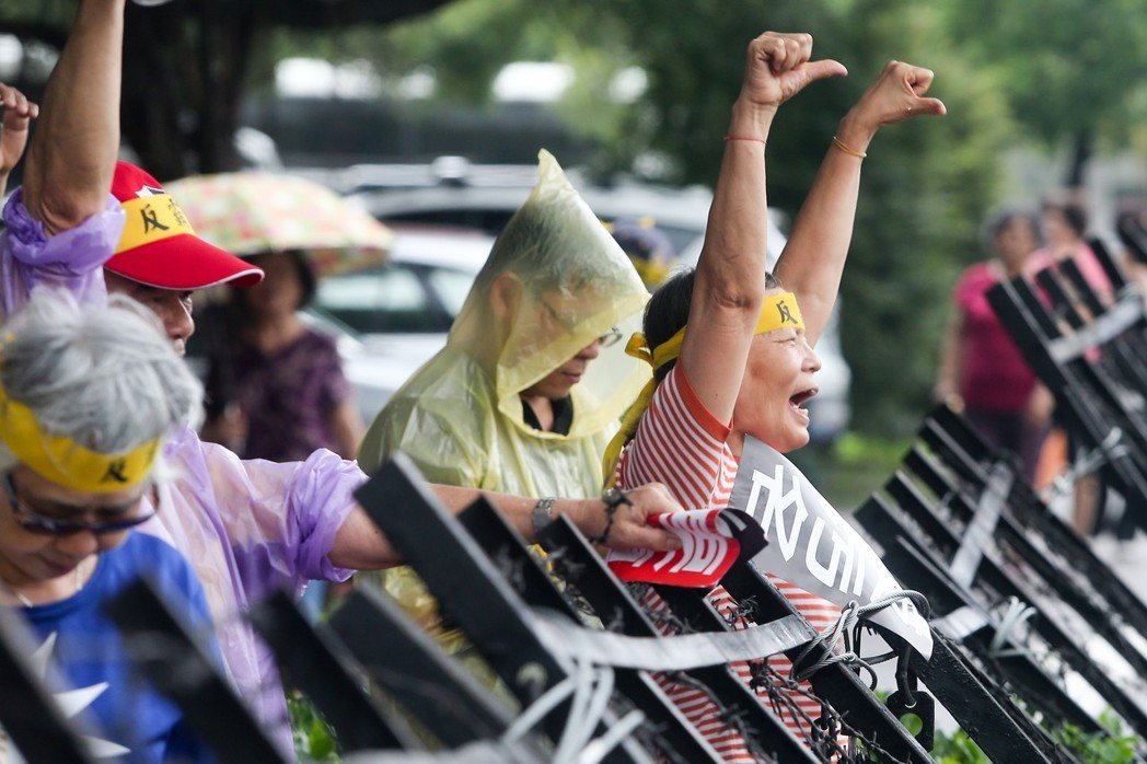 抗議年金改革民眾隔著鐵拒馬用手勢表達不滿。(圖片來源:臺灣《聯(lián)合報》)