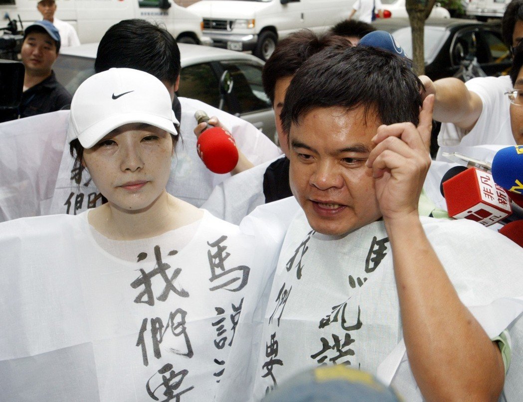 馬英九特別費案獲判無罪,當(dāng)時臺北市議員顏圣冠(左)、莊瑞雄到法院外表達(dá)對判決的不滿。(圖片來源:臺灣《聯(lián)合報》)