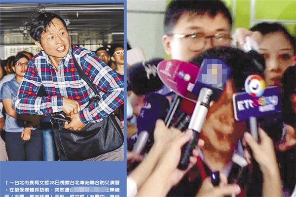 臺北市長柯文哲28日視察臺北車站聯(lián)合防災(zāi)演習(xí),在接受媒體采訪前,突然遭“臺灣國”辦公室主任陳峻涵(左圖)丟鞋,柯文哲(右圖)立刻蹲下身體。(圖片來源:臺灣《中時電子報》)