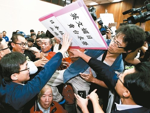 據(jù)臺灣《聯(lián)合報》報道,臺當(dāng)局“農(nóng)委會”12日在云林、嘉義、臺南、高雄連趕4場公聽會。首場臺南場上,國民黨臺南市議員盧昆福、蔡育輝質(zhì)疑主辦單位做法偷渡,弄翻茶水、資料,與“農(nóng)委會國際合作處處長”陳俊言爆發(fā)口角,陳還被推擠至座位上。會議被迫中斷。