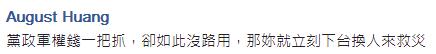 臺(tái)名嘴也氣爆了。資深氣象主播李富城在Facebook表示,真好玩,所有的資源都在你蔡大小姐手中,國(guó)民黨已被你抄家滅族啦,沒(méi)有資源拿什么救災(zāi),再說(shuō),救災(zāi)不就是你執(zhí)政黨的事嗎?如果覺(jué)得救災(zāi)無(wú)能的話,就盡快讓出來(lái),讓有能力的人來(lái)做,不要占著茅坑不拉屎。