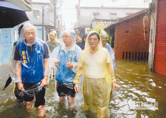 國(guó)民黨高雄市長(zhǎng)參選人韓國(guó)瑜(左)到探視淹水災(zāi)情。(圖片來(lái)源:臺(tái)灣“中時(shí)電子報(bào)”)