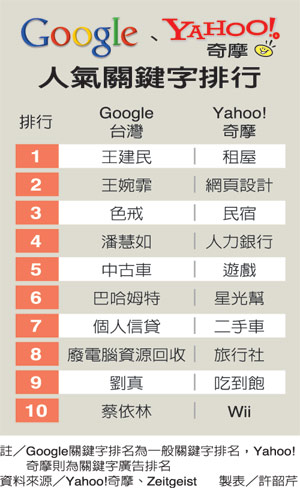 而另一大網(wǎng)絡(luò)搜尋引擎Google發(fā)布的11月臺(tái)灣網(wǎng)友一般關(guān)鍵詞廣告排行榜,前十名幾乎都是王建民、王婉霏、色戒、潘慧如、蔡依林等影視、體育話(huà)題人物。不過(guò)“中古車(chē)”也名列第五名,可見(jiàn)民眾對(duì)于中古車(chē)興趣濃厚。