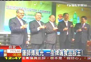 TDR(臺(tái)灣存托憑證)上市第一天康師傅以45元(新臺(tái)幣,下同)高價(jià)開(kāi)出后,馬上漲停至48.15元。有記者問(wèn):“泡面已經(jīng)世界第一,康師傅飲料要不要拼一下世界第一?”康師傅控股公司董事長(zhǎng)魏應(yīng)州:“我常常講,遇強(qiáng)則強(qiáng),遇戰(zhàn)則戰(zhàn),應(yīng)該要有那種企圖!蔽盒轮菡f(shuō):“康師傅飲料有信心拼世界第一。” 目前,康師傅TDR在臺(tái)灣總發(fā)行金額1710億,僅去年?duì)I收就高達(dá)427.2億美金,股價(jià)開(kāi)出,盤中馬上超越統(tǒng)一、天仁,還有同樣回臺(tái)上市的旺旺,穩(wěn)坐食品股股王。