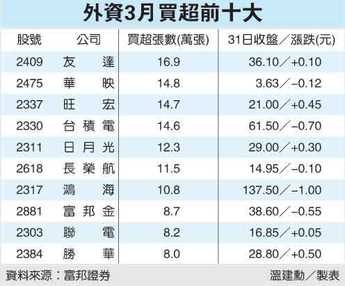 外資3月前十名的買(mǎi)超標(biāo)的集中面板、半導(dǎo)體,其中以友達(dá)買(mǎi)超16.9萬(wàn)張居冠。摩根士丹利科技產(chǎn)業(yè)分析師王安亞,高喊友達(dá)董監(jiān)改選行情啟動(dòng)。友達(dá)融券余額已從1月下旬高峰的2.3萬(wàn)多張,降到昨天的6800多張。王安亞認(rèn)為,友達(dá)在2001年、2004年、2007年分別改選董監(jiān),當(dāng)年股價(jià)都有20%至50%的漲幅,今年友達(dá)的改選行情同樣值得期待;此番論點(diǎn)吸引外資買(mǎi)盤(pán)先行卡位。