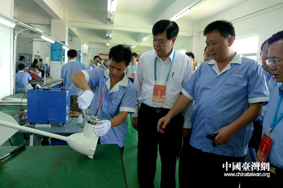 參加第六屆兩岸經(jīng)貿(mào)文化論壇的新能源組參訪團(tuán)代表9日來到廣州紅鷹能源科技有限公司參訪(中國臺灣網(wǎng) 李徽 攝)