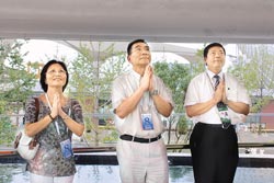 林毅夫(中)偕妻子在點(diǎn)燈水臺許下“美夢成真”、“永保安康”心愿。來源:臺灣《旺報(bào)》