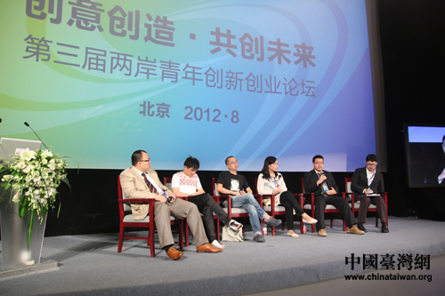主持人與5名兩岸青年創(chuàng)業(yè)家在論壇現(xiàn)場(chǎng)探討創(chuàng)業(yè)環(huán)境與機(jī)遇。(中國(guó)臺(tái)灣網(wǎng) 黃艷艷 攝)