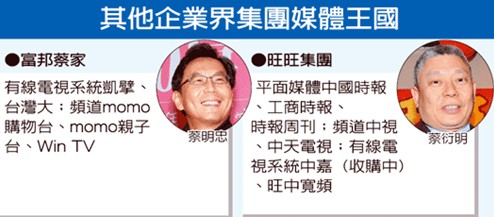 攤開(kāi)兩大集團(tuán)媒體布局,富邦蔡明忠與臺(tái)灣大蔡明興擁有全臺(tái)最大有線電視系統(tǒng)臺(tái)凱擘、有線電視頻道、電信固網(wǎng)等;蔡衍明則獨(dú)缺系統(tǒng)臺(tái),平面媒體與有線、無(wú)線電視頻道一應(yīng)俱全。