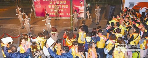 為了歡迎大陸來的頂級消費(fèi)群,該集團(tuán)特地找來臺(tái)軍打扮的儀隊(duì),在游輪?康母劭,以正統(tǒng)軍禮儀式迎賓,前方帶隊(duì)的阿兵哥,雄糾糾、氣昂昂地?fù)]劍引導(dǎo)后方花槍隊(duì)伍,儀式演出一結(jié)束,立刻引來貴婦蜂擁而上、搶拍合照。入臺(tái)后貴婦團(tuán)展開為期5天的環(huán)島之旅。