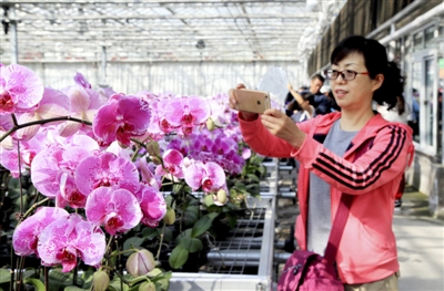 由臺商投資控股的上海雍大實業(yè)有限公司與新疆生產建設兵團第六師五家渠市簽訂了8億元投資協議,在五家渠市建設一個年產3000萬株蘭花的種植基地。目前,基地內已建成2萬余平方米的展區(qū),種植了130余種各色蝴蝶蘭,主要銷往我國西北地區(qū)及絲綢之路沿線各地。圖為近日游客在五家渠市雍大蘭花莊園游覽并拍照留念。 魏新江攝(人民圖片)