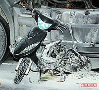 肇事摩托車(chē)事發(fā)時(shí)被砂石車(chē)輪卡住磨地,后半截幾乎消失不見(jiàn)。圖片來(lái)源:臺(tái)灣《蘋(píng)果日?qǐng)?bào)》